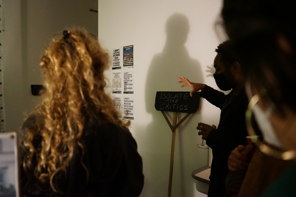 The intention was to create a visible dialogue between the institution and the critique on newly democratised terms. The images, video, found objects and texts, highlight the failings and limitations of institutional self-critique, and present it as a performative act.